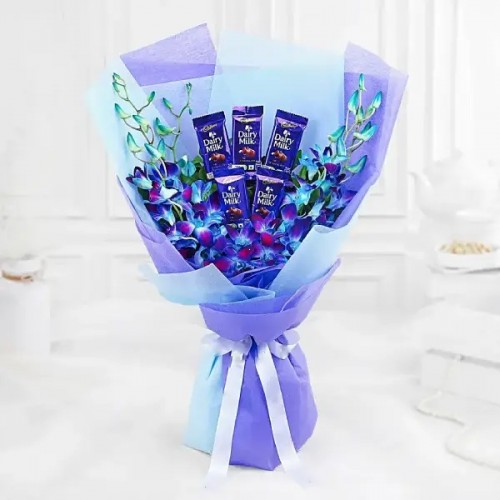 Delight in the elegance of the Ocean Bliss Bouquet, featuring stunning blue orchids paired with delicious chocolates. Enhanced with lush murraya leaves and wrapped in sky-blue paper, this bouquet is a sight to behold. Perfect for birthdays, anniversaries, or to simply brighten someones day, this ensemble suits individuals who appreciate refined beauty and sweet indulgence. The blue orchids symbolise tranquillity and strength, while the rich flavours of chocolate offer a comforting treat. This bouquet is ideal for someone who loves the oceans serene hues and the simple joys of life, making every occasion memorable and special
