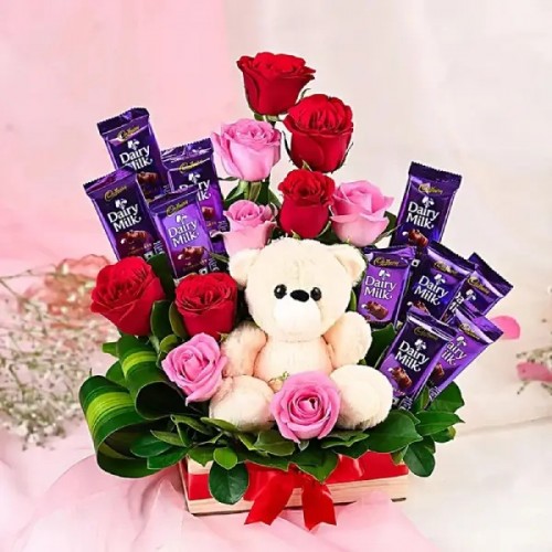 An overload of sweetness and cuteness that never fails to make your loved one go head over heels. This combo of premium flowers, chocolates, graced with a cute teddy celebrates your playful and precious bond with your special one. The red velvet cake makes it a perfect gift to pamper your partner in this season of love.