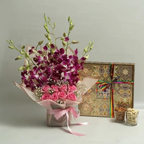 This mindfully curated gift package brings together grace and well-being for your loved ones. A healthy box of premium-quality assorted nutty goodness (dry fruits) is brought as a gift package alongside a lovely arrangement of purple orchids and pink roses in a glass pot, all elegantly encased in white paper and held together with a pink ribbon. It is a present that promotes wellness and expresses your sincere emotions straight from the heart.