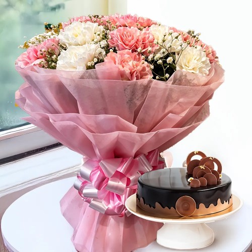 this lovely gift combo includes 15 pink and white carnation tied up in pink wrapping and half kg smooth chocolate cake in a pretty decoration.its a perfect gift for mothers day,anniversary or just to say thanks,offering a touch of elegance and a taste of sweetness.