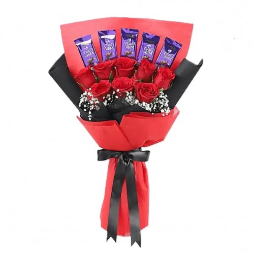 A beautiful Bunch of 8 red roses with cadbury chocolates in long stem standing to cherish your love.