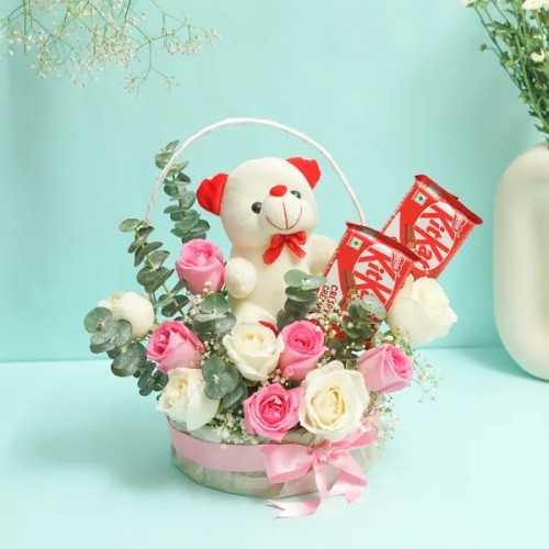 Delight someone special with this charming gift basket featuring five pink and five white roses, a cuddly 5-inch teddy bear that offers a huggable surprise, and two KitKat bars to add a sweet touch. Accented with a silver dollar and presented in a beautiful handle basket wrapped with a pink ribbon, it's perfect for birthdays and romantic gestures to show you care.