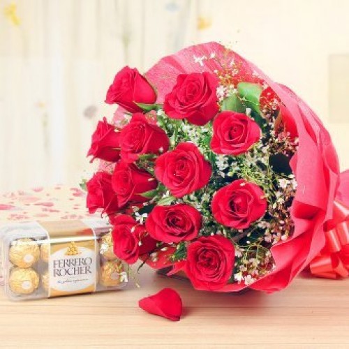 12 RED ROSES IN RED WRAP AND 16 FERRO ROCHER CHOCOLATE