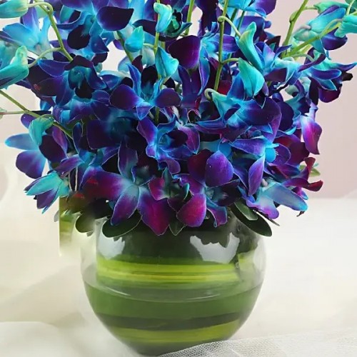 Experience the magnetism of exotic blooms with our breathtaking Blue Orchids Vase. Orchids are the perfect flower gift to surprise your beloved and your dear ones and make any occasion unforgettable. This floral arrangement features lively blue orchids in a chic glass vase, making it a stunning centrepiece of any space and making it even more exciting.