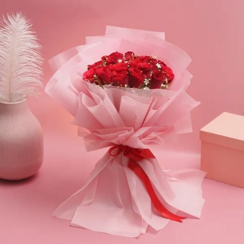 Nothing speaks of deep love, passion, and gratitude quite like our Red Roses in Pink Wrap bouquet. This classic beauty with a Pink touch of love features fifteen red roses encased in rich pink paper and held together with a matching red ribbon to create an indelible impression on the heart of your special someone.