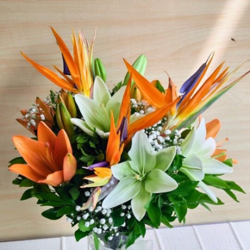 A bold and uplifting floral composition featuring birds of paradise, lilies, orange lilies and fresh greens, hand-arranged in a clear glass vase. Designed to make an impact, this arrangement brings together sculptural lines and vibrant hues, making it ideal for modern spaces and meaningful celebrations.
