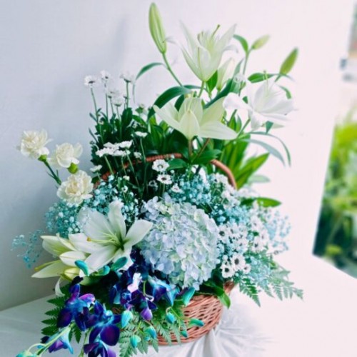 A delightful mix of white lilies, hydrangeas, carnations, Santini, orchids, and baby’s breath, thoughtfully arranged in a rustic cane basket. The soothing whites and soft blues paired with a pop of vibrant orchids make this basket a graceful choice for birthdays, anniversaries, or any special celebration