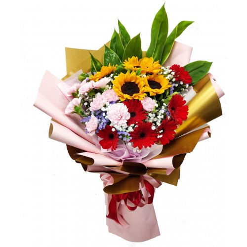 Mixed Carnation, Sunflowers and daisies in a special hand bouquet.