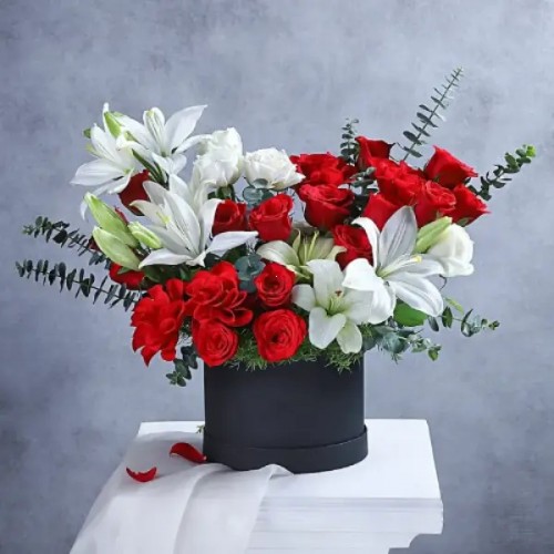 Like a suave surprise, blended with nature's best, the ensemble echoes celebration with a touch of luxury. The assortment is a peek into the finer things in life, featuring red roses, white roses and white Asiatic lilies, bundled together to perfection. Making way for opulence on occasions like anniversaries, house warming, birthdays, best wishes or just because.