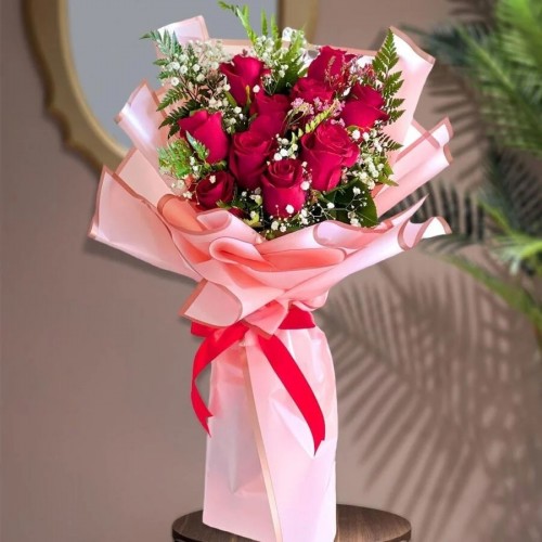 Surprise your loved one with 10 beautiful red roses expertly wrapped in pink paper sheets. The perfect gift to show your affection and make them feel special. Express your love with these vibrant, romantic roses!