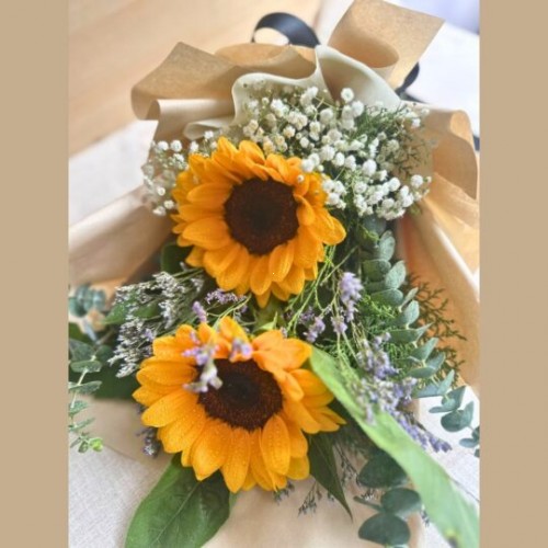 A cheerful hand-tied bouquet featuring vibrant sunflowers, delicately paired with baby’s breath, seasonal fillers, and fresh eucalyptus greens. Wrapped in soft neutral paper and finished with a classic ribbon, this arrangement radiates warmth, optimism, and natural charm.