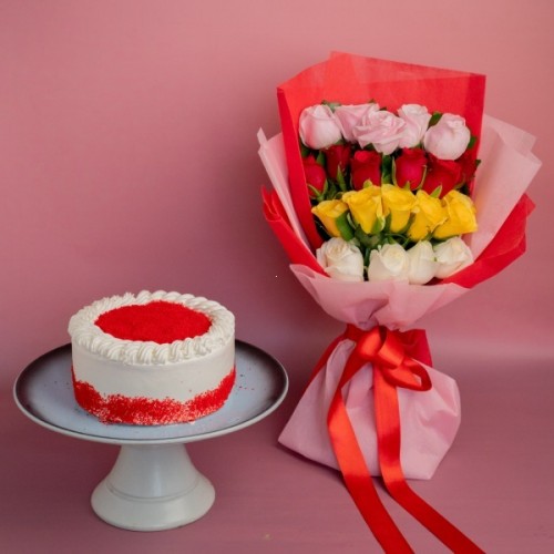 Our red roses bouquet with heart-shaped velvet cake brings you an ideal match of flowers & flavours. This dazzling duo of deep love and sweetness features red roses, their beauty enriched by seasonal green leaves with heart-shaped red velvet cake, adding a sweet romantic surprise. This romantic gift package is a captivating gift for your special someone to convey your sincere emotions and sentiments to make them feel loved, valued, and cherished.
